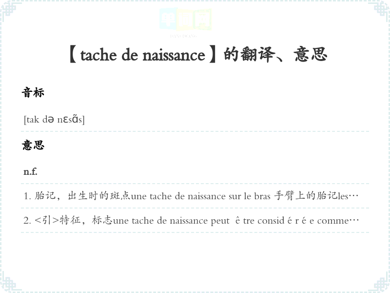 胎记,出生时的斑点une tache de naissance sur le bras 手臂上的胎记les taches de naissance peuvent varier en couleur 胎记的颜色可能会有所不同