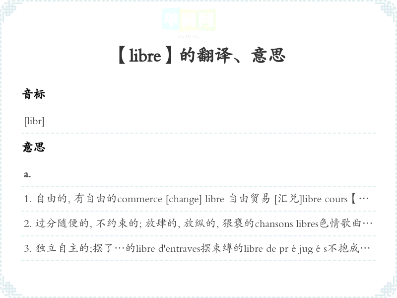 【libre】 名词变化:、 近义词:、 反义词: 联想词