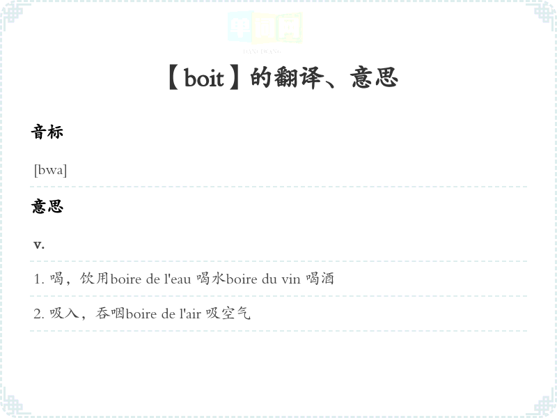 喝,饮用boire de l'eau 喝水boire du vin 喝酒
