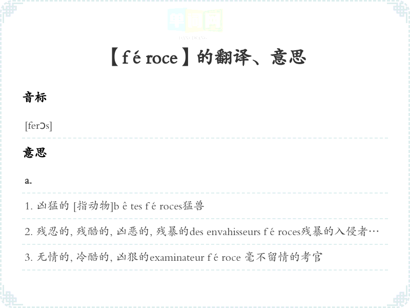 【féroce】 助记:、 联想:、 近义词:、 反义词: 联想词