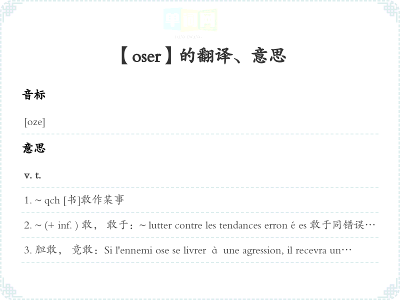 ~ (+ inf. ) 敢, 敢于:~ lutter contre les tendances erronées 敢于同错误倾向作斗争~ poser une question. 敢于提出问题Il n'ose pas dire. 他不敢讲. {在否定句中, 不用pas 或point时, 表示否定的语气较弱}:Je n'ose vous déranger. 我真不敢。 [有时表示说话人讲话时的谨慎、谦虚或表示加强希望的语气]:Si j'ose dire. 如果我冒昧地讲 (一句)。 J'ose espérer que vous accepterez. 我大胆地希望能接受。