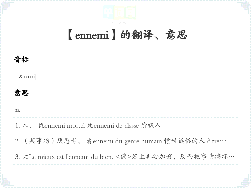 【ennemi】 联想:、 近义词:、 反义词: 联想词