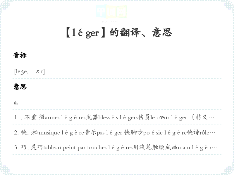 【léger】 助记:、 词根:、 联想:、 近义词:、 反义词: 联想词