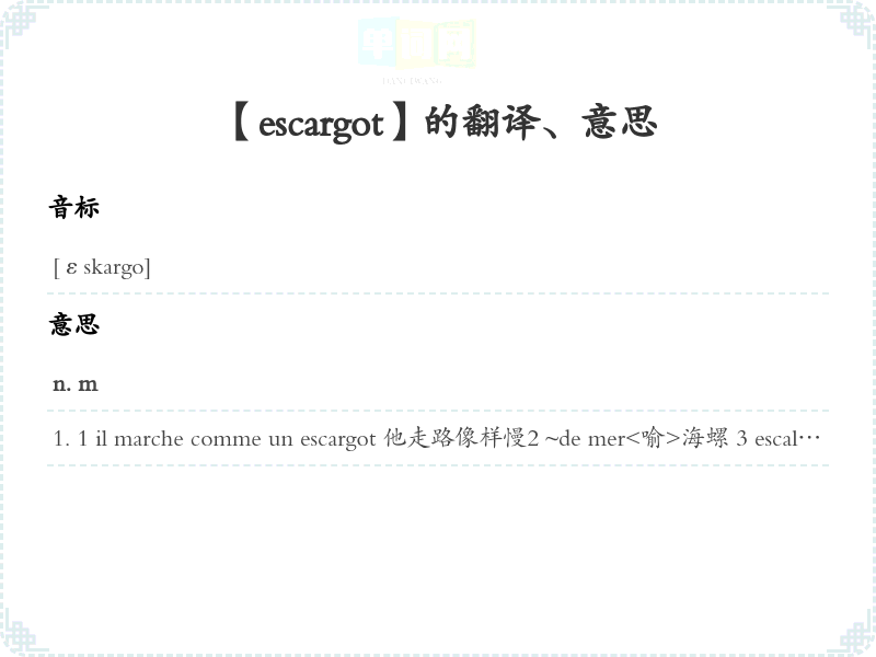 1 il marche comme un escargot 他走路像样慢2 ~de mer<喻>海螺 3 escalier en~螺旋式楼梯喻>脑筋迟钝的人; 凸状涡形轮; 行动迟缓的人; 形凸轮