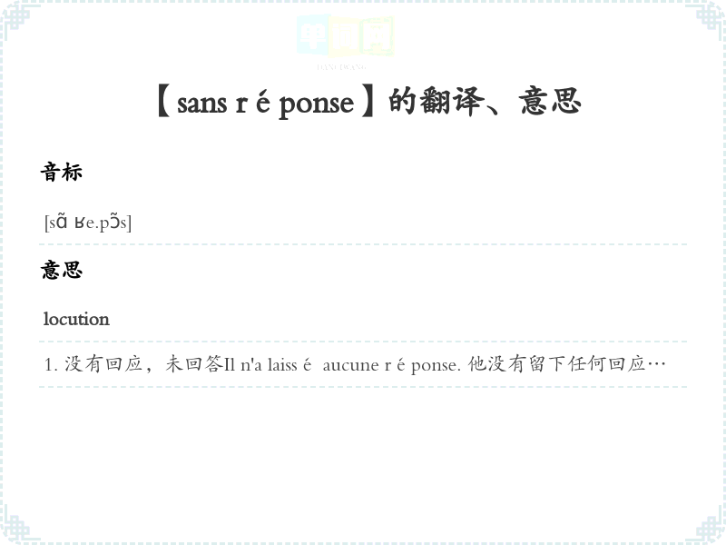 没有回应,未回答Il n'a laissé aucune réponse. 他没有留下任何回应。Une question sans réponse. 一个没有回答的问题。