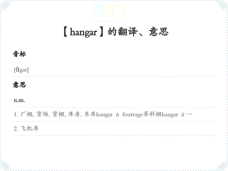 厂棚, 货场, 货棚, 库房, 车库hangar à fourrage草料棚hangar à locomotives机车库