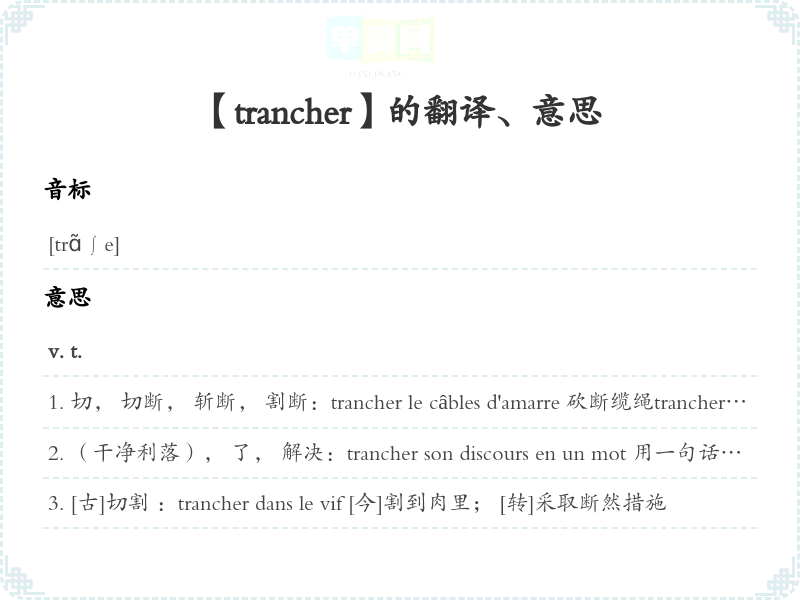 (干净利落), 了, 解决:trancher son discours en un mot 用一句话自己的讲话trancher le mot [书]直率讲trancher une question (une difficulté) 解决一个问题[一个困难][宾语省略]Tranchons là. 咱们就谈到这儿吧。v. i.