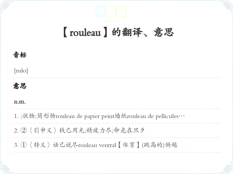 ;状物;筒形物rouleau de papier peint墙纸rouleau de pellicules photographiques胶donner un rouleau à développer交托冲洗胶片rouleau de printemps春être au bout de son rouleau