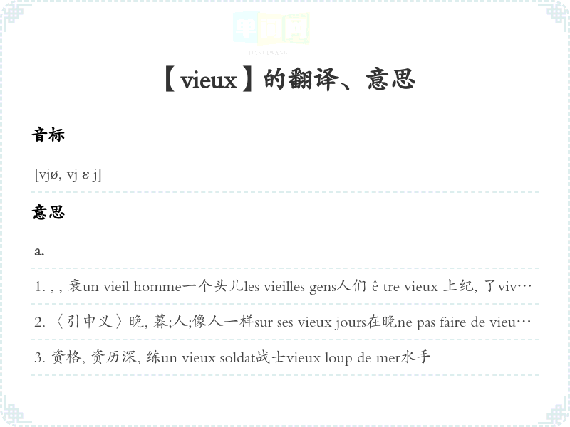 〈引申义〉晚, 暮;人;像人一样sur ses vieux jours在晚ne pas faire de vieux os〈口语〉活不到, 活不长Je ne ferai pas de vieux os ici.我在这儿呆不长。[用作adv.]s'habiller vieux 穿得气