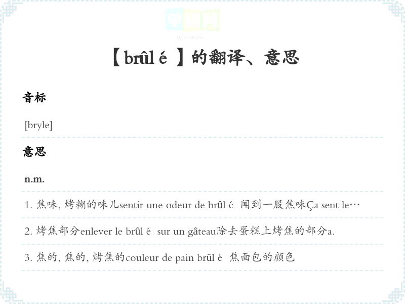 焦味, 烤糊的味儿sentir une odeur de brûlé 闻到一股焦味Ça sent le brûlé .有股焦味。〈转〉事情有点不妙。