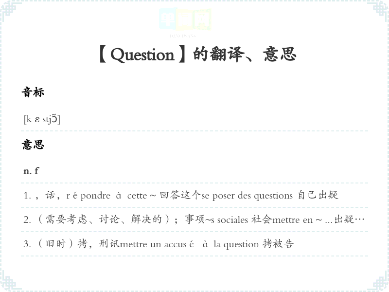 (需要考虑、讨论、解决的);事项~s sociales 社会mettre en ~ ...出疑en ~ 的Le projet en question est intéressant pour nous. 我们的草案感兴趣。Il n'en est pas ~. 绝不行。Là est toute la question. 全部就在这里。