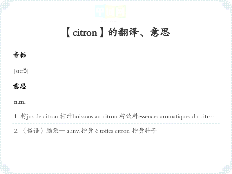 柠jus de citron 柠汁boissons au citron 柠饮料essences aromatiques du citron 柠香精une rondelle [tranche] de citron 片柠être jaune comme un citron 〈转义〉面色蜡黄presser qn comme un citron 〈转义〉榨尽某人脂膏