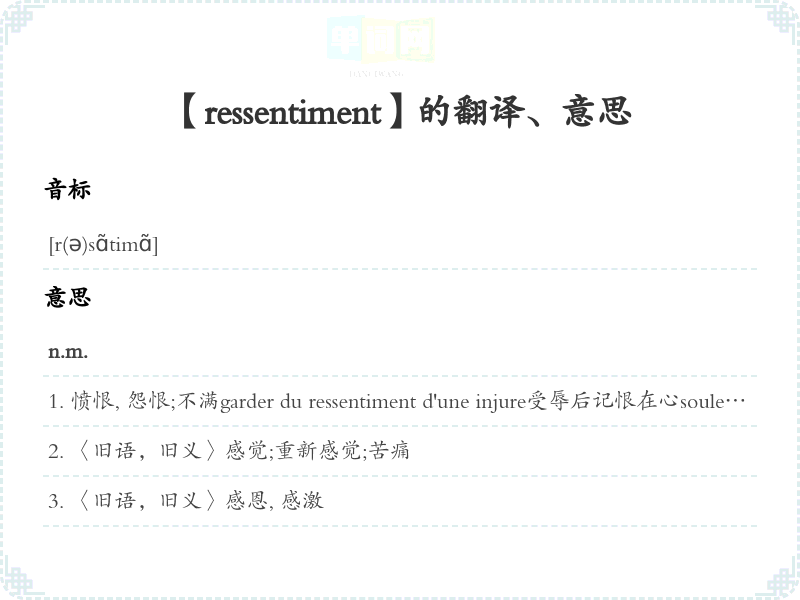 愤恨, 怨恨;不满garder du ressentiment d'une injure受辱后记恨在心soulever le ressentiment de qn引起某人的怨恨