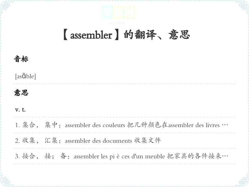聚集, 召开; 召集…开会:Notre amitié militante nous assemble. 我们的战斗友谊把我们接在。 assembler le conseil 召开会议s'assembler v. pr.汇集, 聚集, 集会:Qui se ressemble s'assemble. [谚]物以类聚, 人以群分。 La foule s'assemble sur la place pour voir le feu d'artifice. 人群聚集在广场上观看烟火