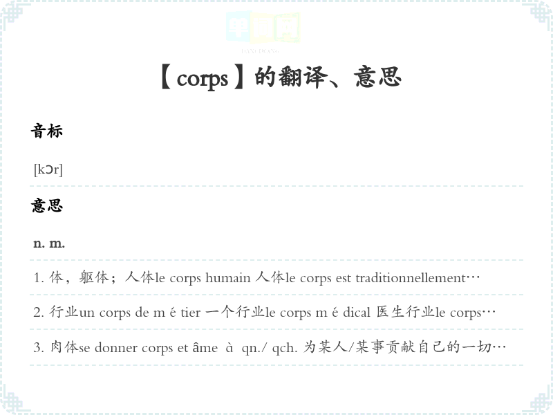 【corps】 联想:、 形容词变化:、 副词变化:、 近义词:、 反义词: 联想词