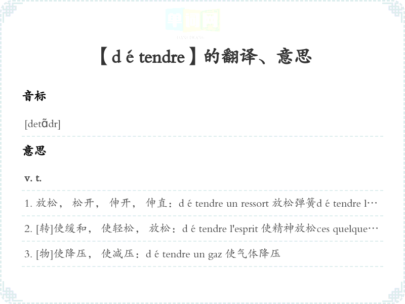 [转]使缓和, 使轻松, 放松:détendre l'esprit 使精神放松ces quelques jours à la campagne l'ont détendu. 在乡下小住几日使他到了放松。