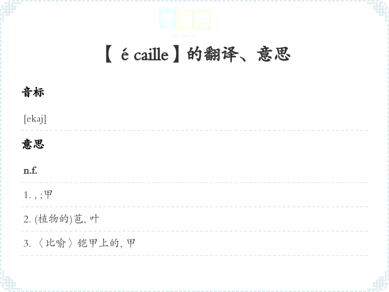 玳瑁的质板;〈引申义〉玳瑁状合成树脂peigne en écaille 玳瑁梳子lunettes à monture d'écaille 玳瑁架眼镜veau écaille (作书面用的)纹小牛皮