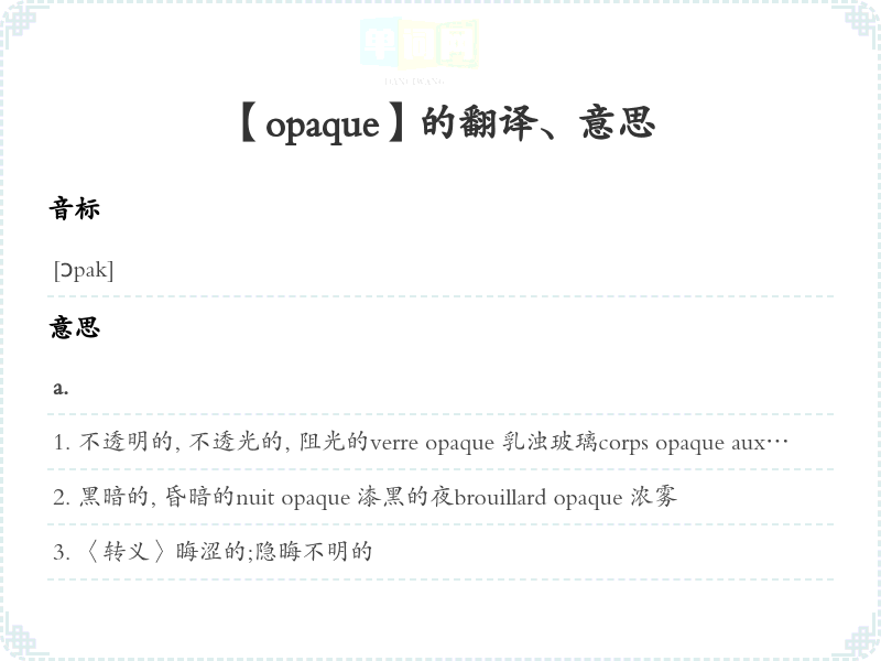 【opaque】 联想:、 近义词:、 反义词: 联想词