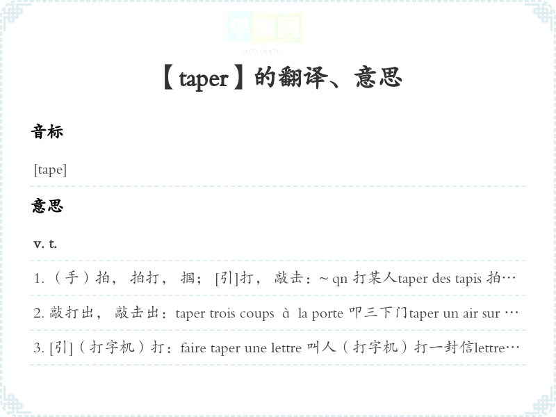 (手掌)拍, 拍打, 掴; 打, 敲击:Je lui tapai sur l'épaule. 我在他肩上拍一下。 taper sur un clou pour l'enfoncer 把一个钉子敲直去taper des poings 拳打taper des pieds 跺脚, 顿足taper comme un sourd 痛打, 狠命打[俗];taper sur qn 殴打某人; [转]背后说某人坏话taper sur le ventre de qn 对某人过分亲昵taper sur les nerfs 叫人恼怒taper dans l'œil de qn 使某人一看就十分中意taper dans le mille 成功; 猜中