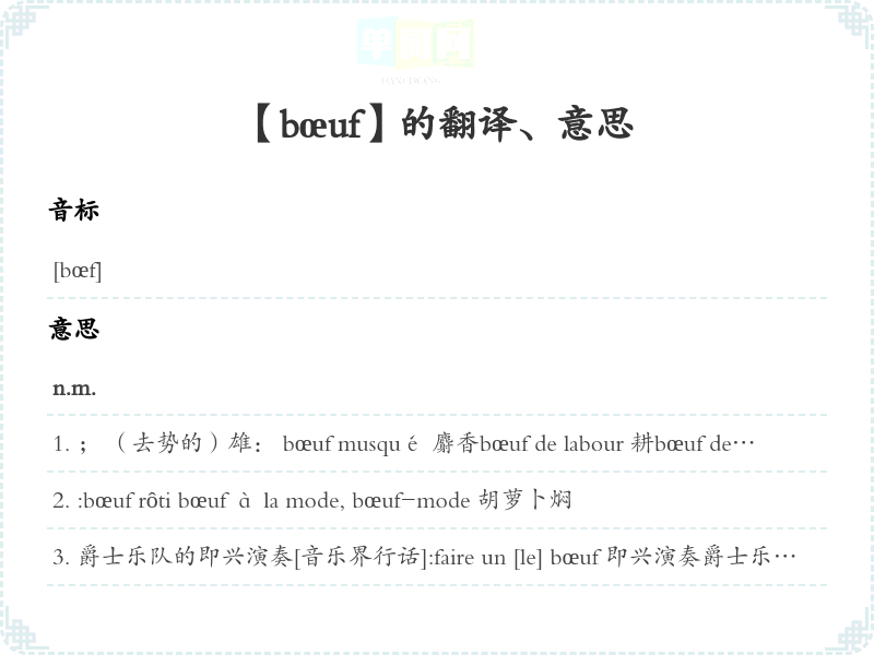 ; (去势的)雄: bœuf musqué 麝香bœuf de labour 耕bœuf de boucherie 食用,菜bœuf gras [bøgra] (狂欢节中盛饰游街的)肥fort comme un bœuf 健壮如