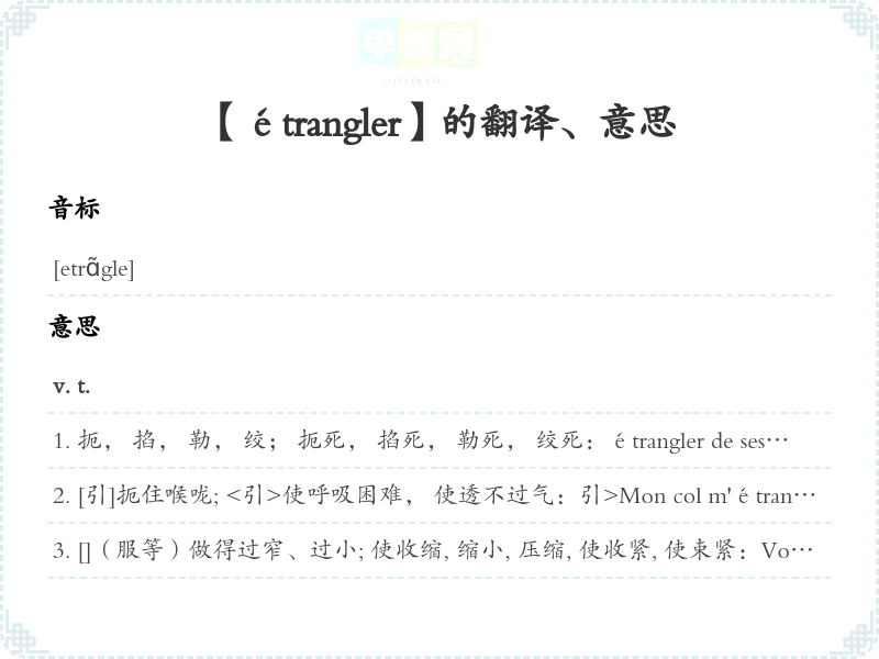 绞; 卷v. i.透不过气:étrangler de colère 气得透不过气s'étrangler v. pr.