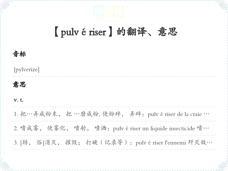 【pulvériser】 联想:、 近义词:、 反义词: 联想词