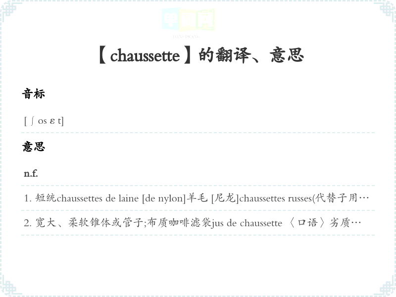 短统chaussettes de laine [de nylon]羊毛 [尼龙]chaussettes russes(代替子用)包脚布chaussettes à clous〈俗语〉上鞋鞋laisser tomber qn comme une vieille chaussette 某人一甩了之retourner qn comme une vieille chaussette 某人像旧子一样翻过来 [意谓很容易使某人改变意见]