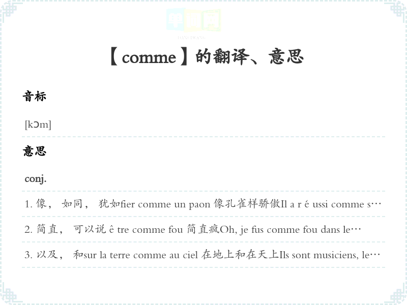 多么; 怎么, 怎样Comme c'est cher! 这多么贵啊!Tu sais comme elle était. 你知道她以前是怎样个人。il faut voir comme 出色地Il lui a répondu, il faut voir comme. 他回答他的话,那可真叫说得棒哩!Comme vous y allez! <口>瞧您说到哪儿去!太过分!口>