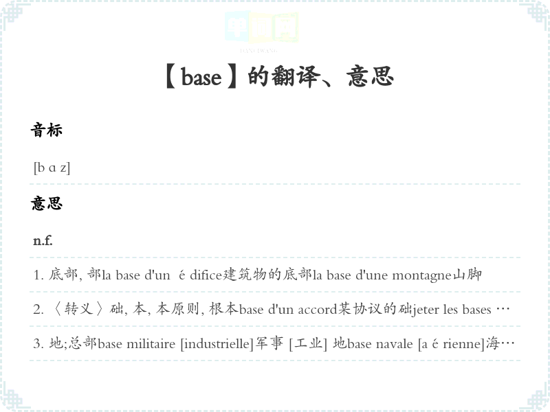 〈转义〉础, 本, 本原则, 根本base d'un accord某协议的础jeter les bases de qch.奠定…的础sur la base de在…础上à base de:以…为原料: un cocktail à base de gin 以杜松子酒为主调制的鸡尾酒salaire de base 薪, 底薪avoir de bonnes bases en mathématiques数学础扎实