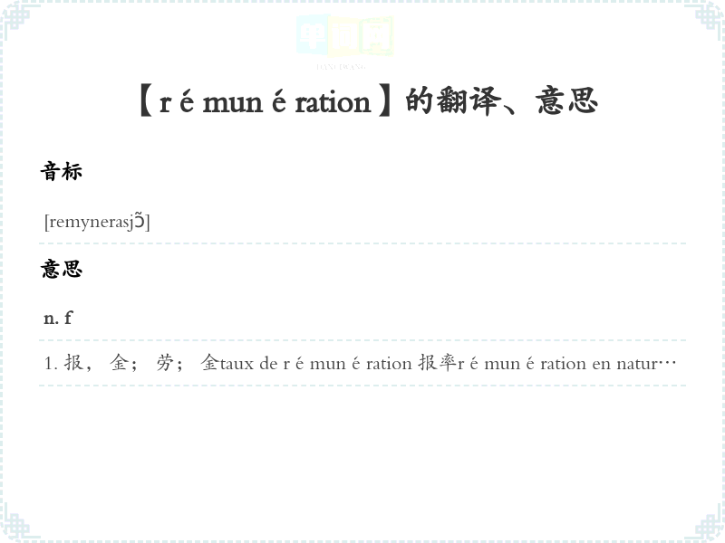 报, 金; 劳; 金taux de rémunération 报率rémunération en nature 实物报rémunération mensuelle 月薪