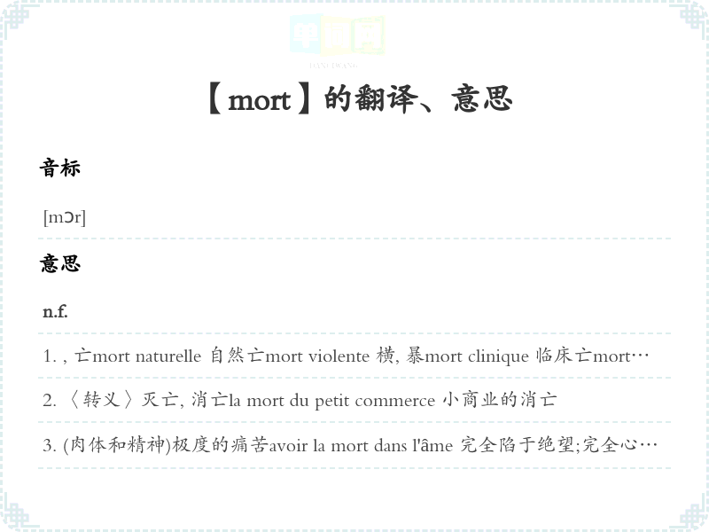 过去的, 不复存在的, 废弃的;不能再用的, 用坏了的Ces piles sont mortes 这些电池已不能再用了langue morte 语, 语言Ces pneus sont morts. 这些轮胎不能用了。Le passé est bien mort pour moi.过去的事我再也不愿提起。n.人, 者pâle comme un mort 人般地苍白ensevelir les morts 将尸体入殓accident qui a fait un mort et trois blessés 造成一人亡三人受伤的事故faire le mort 装;一动不动;〈转义〉不动声色;袖手旁观être à la place du mort 〈口语〉(汽车里)坐在司机旁边的座位上un mort vivant 期不远的人médecin des morts 〈口语〉法医le jour des morts 【宗教】万灵节 [11月2日]mort civil 【法律】被褫夺公权的人n.m.(桥牌中的)明家;摊出的牌à mortloc.adv.