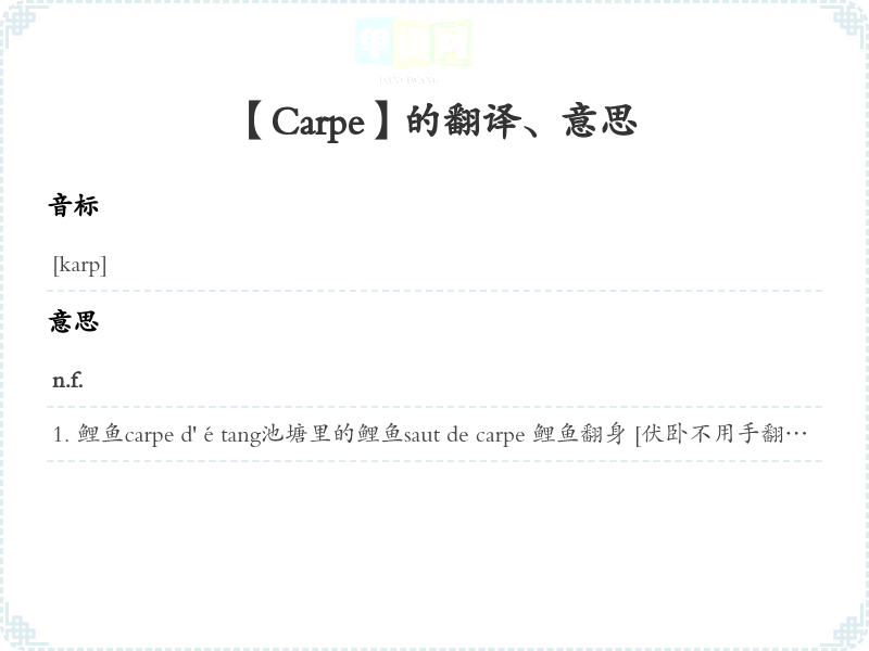 鲤鱼carpe d'étang池塘里的鲤鱼saut de carpe 鲤鱼翻身 [伏卧不用手翻转身]faire des yeux de carpe 用恋慕的眼光凝视être ignorant comme une carpe 非常无知être [rester] muet comme une carpe 保持缄默bâiller comme une carpe 大声连打呵欠n.m.【解剖学】腕