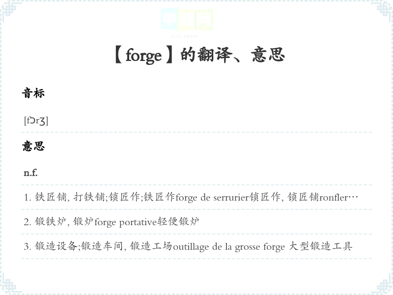 铁匠铺, 打铁铺;锁匠作;铁匠作forge de serrurier锁匠作, 锁匠铺ronfler comme une forge , ronfler comme un soufflet de forge 〈比喻〉鼾声如雷