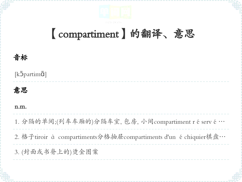 【compartiment】 动词变化:、 近义词:、 反义词: 联想词