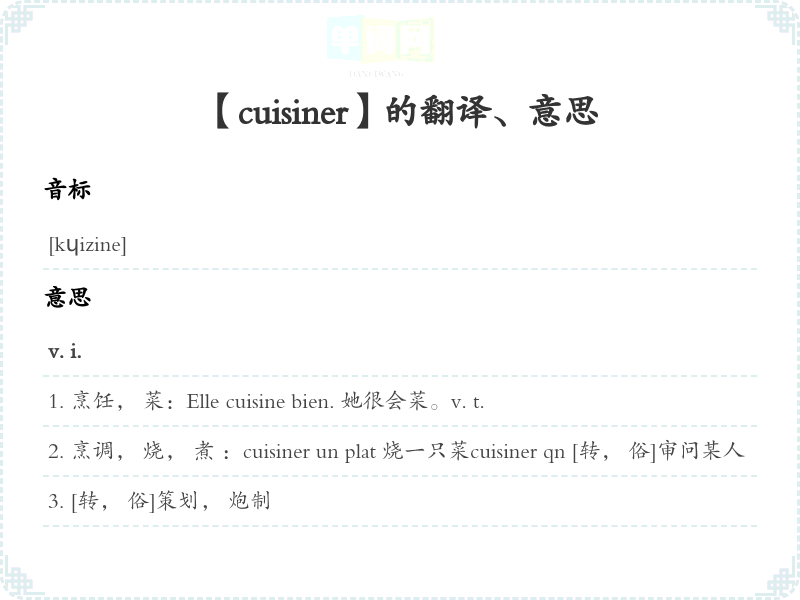 烹饪, 菜:Elle cuisine bien. 她很会菜。v. t.
