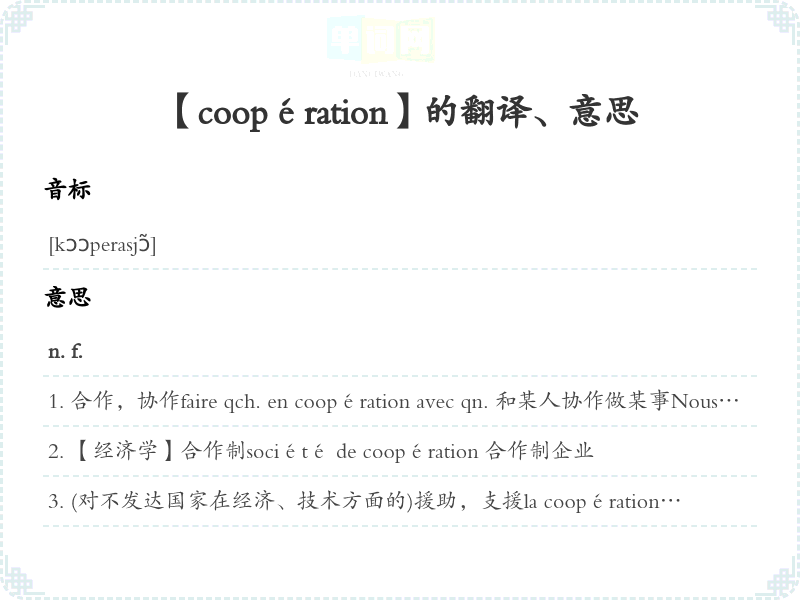 合作,协作faire qch. en coopération avec qn. 和某人协作做某事Nous avons besoin de votre coopération. 我们需要您的帮助。