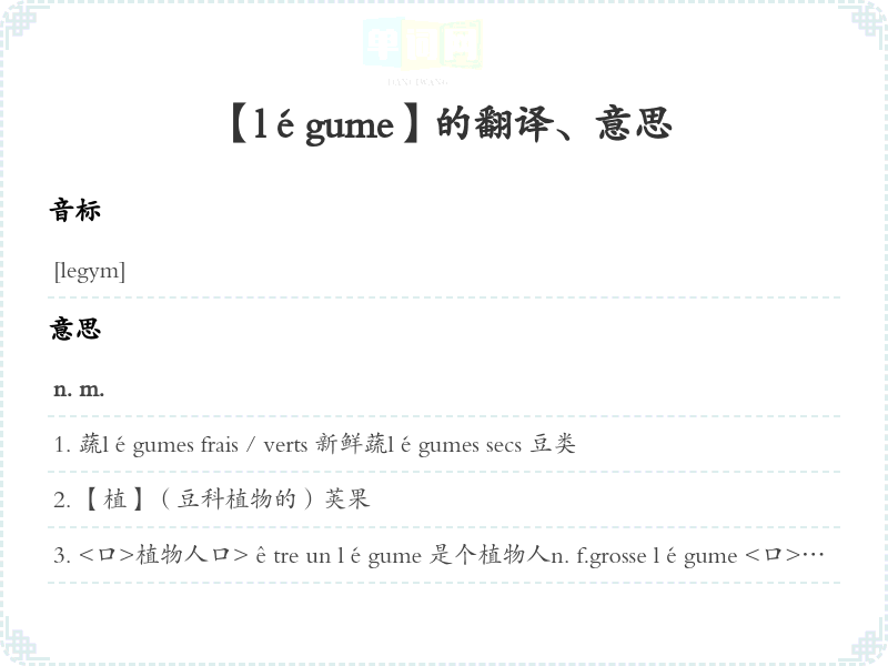 <口>植物人口>être un légume 是个植物人n. f.grosse légume <口>大人物口>