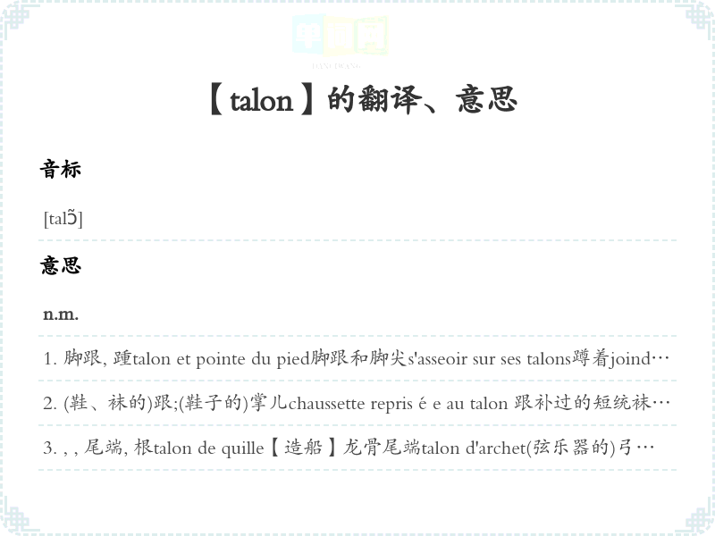 (鞋、袜的)跟;(鞋子的)掌儿chaussette reprisée au talon 跟补过的短统袜talons plats [hauts]平 [] 跟talons aiguilles细跟talon rouge红跟 [17世纪法国对穿红跟鞋的贵族的称呼]; 〈转义〉〈书面语〉风雅的人faire remettre des talons à ses chaussures鞋子送去钉掌儿