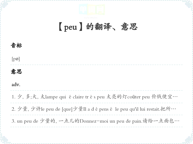 [用限定词, 没有补语, 单独使用] 少量, 少许, 一点点homme de peu 社会地位低下的人;低贱的人;小人vivre de peu 生活Il est content de peu .贪多。Je ne vais pas me décourager pour si peu .会为这么一点点小事就灰心丧气。C'est peu .这太少了。C'est peu de...…是够的C'est trop peu dire.这样说还太轻。peu s'en faut, il s'en faut de peu 几乎, 差点儿, 差多Très peu pour moi.〈口语〉感兴。在乎。 [表示拒绝的客套语]un (petit) peuloc.adv.一点儿, 一下, 少许, 稍微Attendez un peu .请您稍等一下。être un peu fat有点自命凡Il ne travaille pas qu'un peu .活儿干得可少。un peu plus [moins, mieux]稍微多 [少, 好] 一点[口语中表示语气减弱的命令或强调自己的意见]Venez ici un peu , que je vous parle.您过来一下, 跟您讲话。[表示礼貌或讽刺][表示十分肯定]Tu ferais ça?— Un peu ! 这事你敢做吗? —那还用说!peu à peuloc.adv.一点儿一点儿地, 逐渐地, 渐渐地à peu (de chose) prèsloc.adv.大约, 差多, 差离, 几乎Ils sont à peu près du même âge.们几乎都是同年的。[用作n.m.]Il se contente d'à peu près et ne va jamais au fond des choses.总是满足于差多而从深究。 un à peu près 一种文字游戏 [以近似的词或故意改变词形的词代替]peu ou prouloc.adv.〈书面语〉多少, 多多少少, 或多或少aussi [si, trop] peuloc.adv.同样 [如此, 过分] 少Vous m'en donnerez aussi peu qu'il vous plaira.您乐意给多少就给多少。Il a plu, mais si peu que rien.〈口语〉下过雨了, 可是小得像没下过。dans [sous, avant] peu , avant qu'il soit peuloc.adv.久以后Il arrivera dans peu .久就要到了。de peuloc.adv.差一点儿Vous êtes de peu arrivé le premier.您几乎是第一个到。depuis peuloc.adv.久前peu aprèsloc.adv.过了一会儿, 过久quelque peuloc.adv.〈书面语〉一些, 有点tant soit peuloc.adv.稍微一点, 很少一点点Attendez tant soit peu .请稍等片刻。[用作n.m.]Donnez-m'en un tant soit peu .请给一点点。pour un peuloc.adv.差一点, 几乎 [后接condit.]Pour un peu je partirais.差点儿就走了。si peu queloc.conj.尽管…很少 [后接subj.]Si peu de tête qu'il ait, il aurait pu penser à mon anniversaire.尽管那么没有头脑, 的生日总该想到吧。si peu que ce soit论多少, 只要稍微一点儿pour peu queloc.conj.只要稍微… [后接subj.]Pour peu qu'on réfléchisse, on comprendra que...只要稍微思索一下, 就会理解…