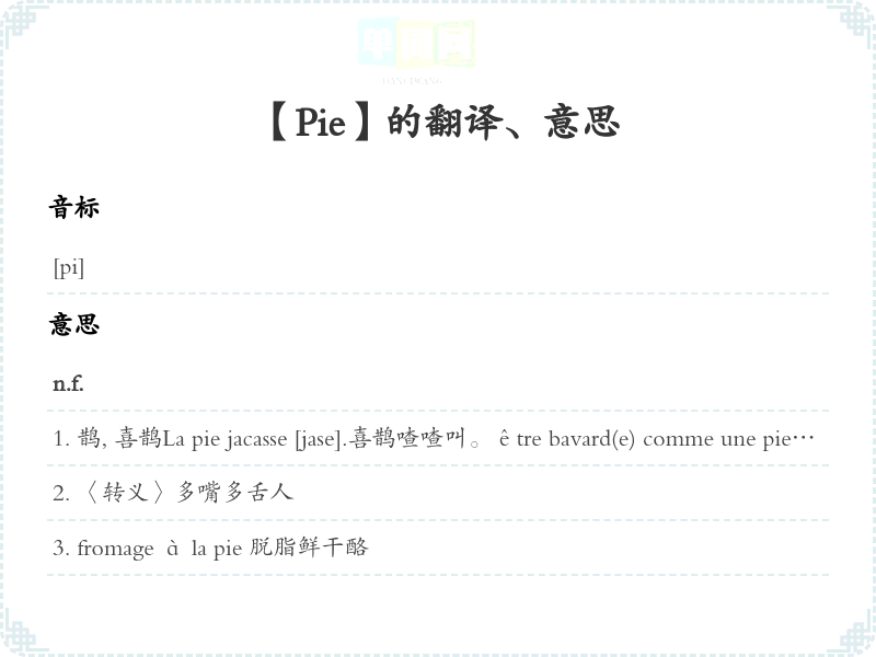 鹊, 喜鹊La pie jacasse [jase].喜鹊喳喳叫。être bavard(e) comme une pie 〈口语〉多嘴多舌, 像喜鹊一样乱呱嗒trouver la pie au nid〈转义〉有重大发现