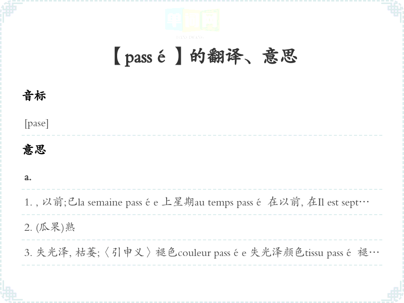 , 以, 昔jeter un coup d'œil sur le passé 看一看avoir le culte du passé 是守旧派par le passé 在, 在以前Tout ça, c'est du passé .〈口语〉这一切都是事了。passé d'une ville〈引申义〉某一城市