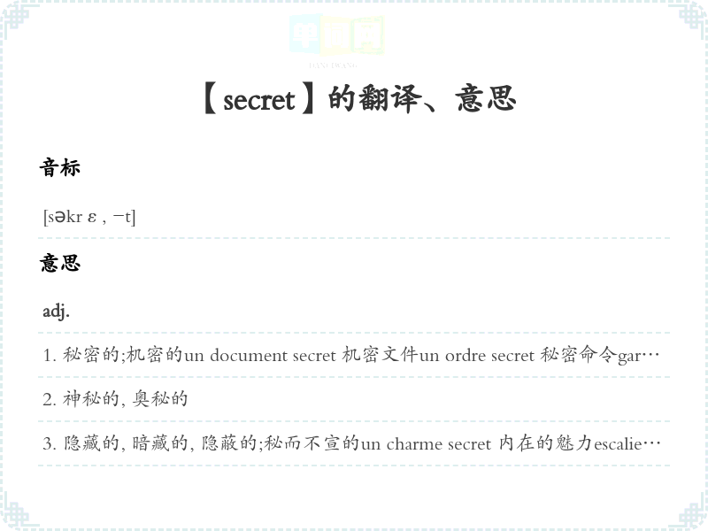 秘密的;机密的un document secret 机密文件un ordre secret 秘密命令garder [tenir] une chose secrète 对件秘密codes secrets 密码négociations secrètes 秘密谈判fonds secrets(政府掌握而不必让议会知道其用途的)秘密经费(police) secrète 秘密警察services secrets 情报处agent secret 特工人员, 特务maladie secrète 性病vie secrète 私生活