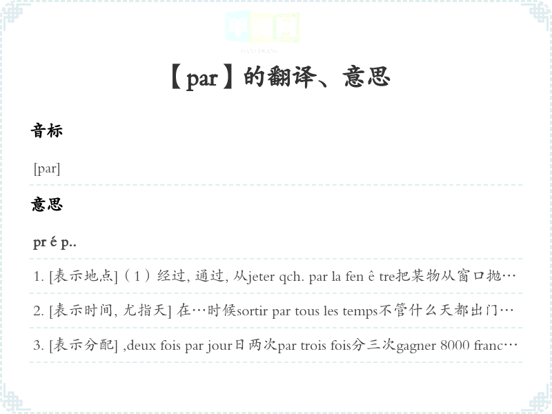 [表示起点或终点] 以finir par la victoire以胜利结束par troploc.adv.实在太过分地par -làloc.adv.在这里或那里, 在有些地方;有时候de parloc.prép.因为, 由于;以…的名义de par la loi根据法律n.m.(高尔夫球赛中的)标准杆数