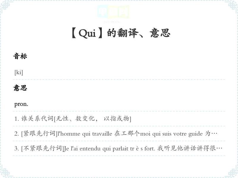 [紧跟先行词]l'homme qui travaille 在工那个moi qui suis votre guide 为您向导我le gouvernement qui a été formé par... 由…组成政府Ceux qui n'ont pas fini pourront revenir demain. 没有做完以明天再来。 Racontez ce qui vous est arrivé hier. 把您昨天遇到事讲一讲。 J'ai trouvé la pièce qui me manquait. 我找到了缺少那个零件。