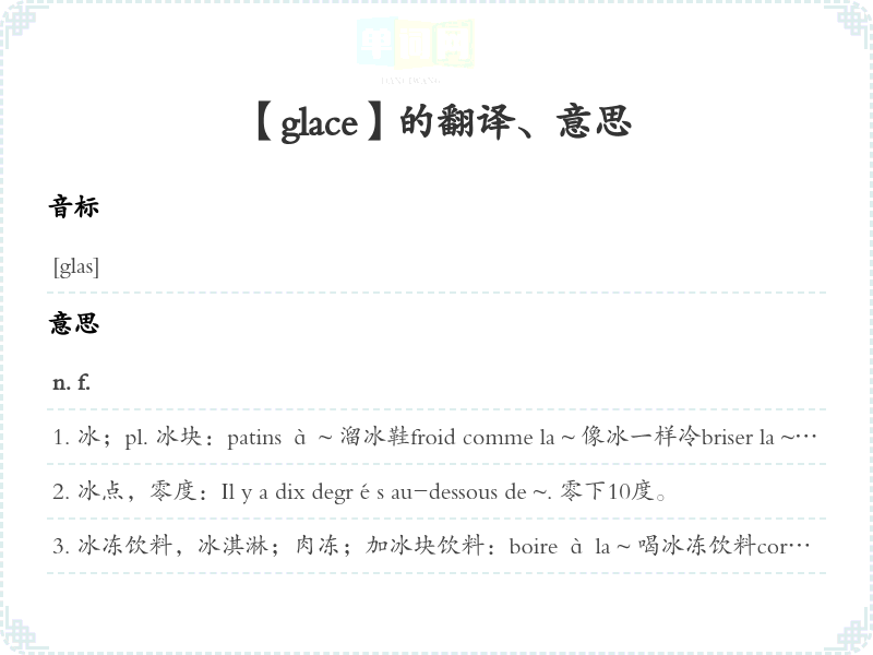 【glace】 联想:、 近义词:、 反义词: 联想词
