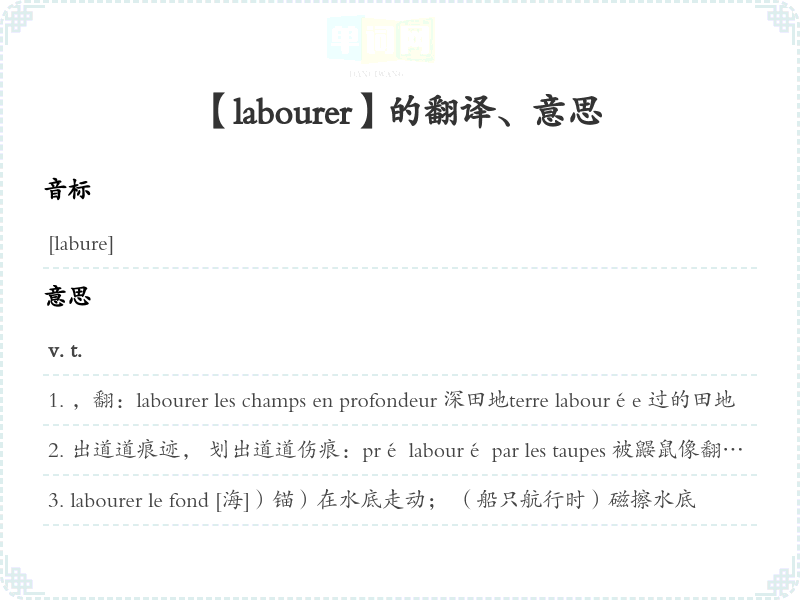 出道道痕迹, 划出道道伤痕:pré labouré par les taupes 被鼹鼠像翻过似的草地visage labouré de rides 布皱纹的脸se labourer le visage avec les ongles 抓伤自己的脸