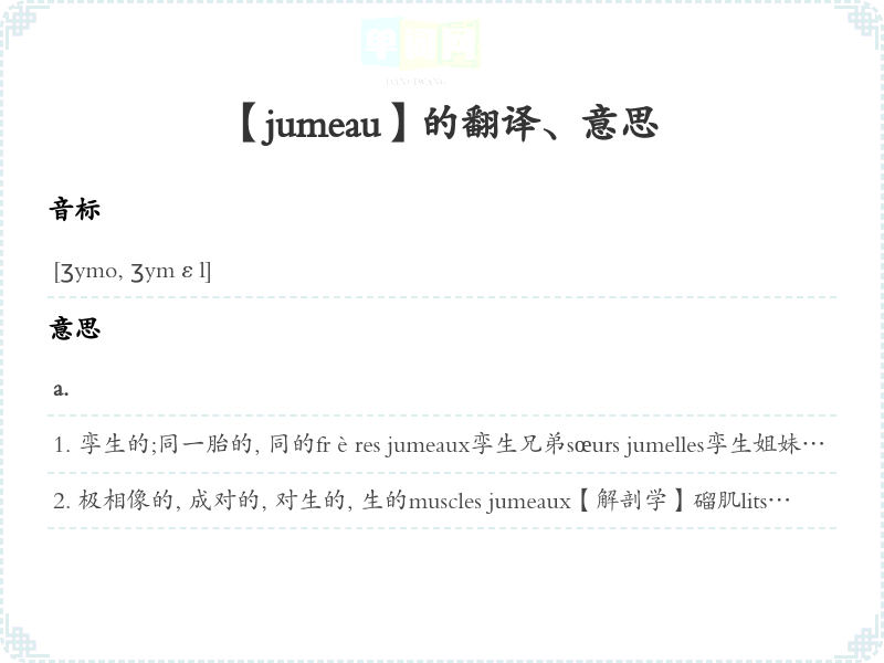 孪生的;同一胎的, 同的frères jumeaux孪生兄弟sœurs jumelles孪生姐妹Ils sont jumeaux.他们是胎。des chiens jumeaux同一胎生的狗