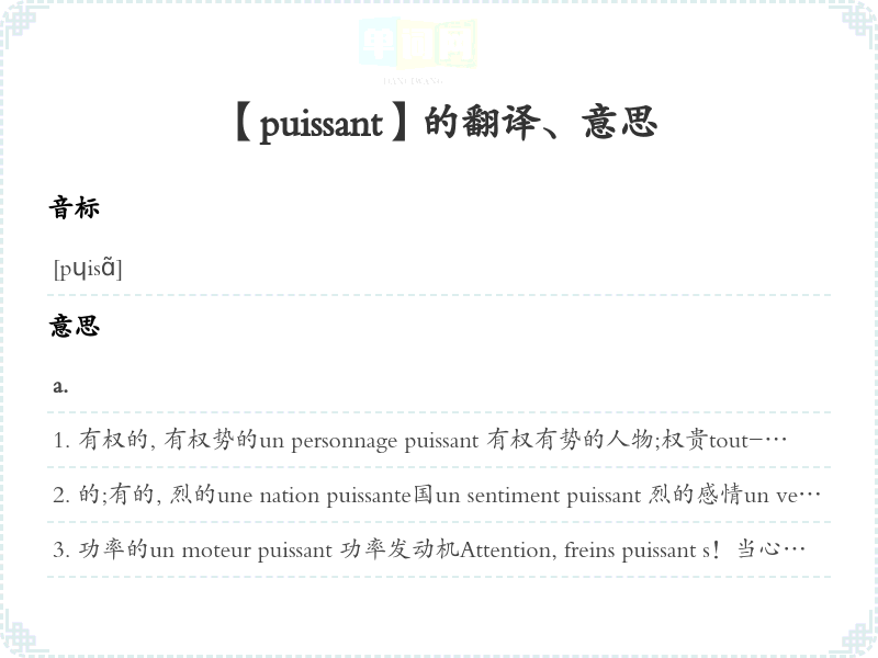 的;有的, 烈的une nation puissante国un sentiment puissant 烈的感情un vent puissant 风une voix puissante有的声音une puissante armée一支的军队
