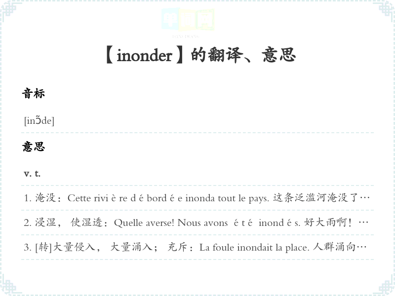 【inonder】 派生:、 联想:、 近义词:、 反义词: 联想词