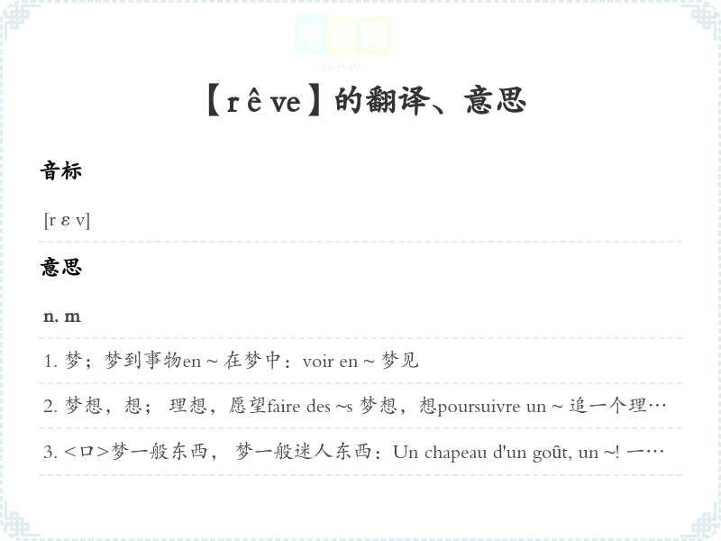 梦想,想; 理想,愿望faire des ~s 梦想,想poursuivre un ~ 追一个理想~s fous 妄想la femme de ses ~s 他梦中情人de ~ 梦一般,梦,朦胧